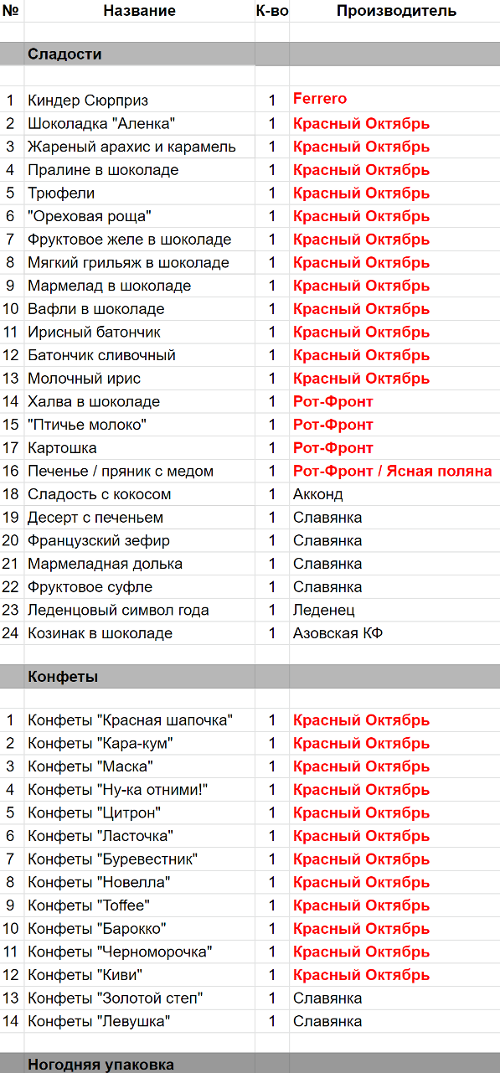 Шоколадка "Аленка" (1 шт), Жареный арахис и карамель (1 шт), Пралине в шоколаде (1 шт), Трюфели (1 шт), "Ореховая роща" (1 шт), Фруктовое желе в шоколаде (1 шт), Мягкий грильяж в шоколаде (1 шт), Мармелад в шоколаде (1 шт), Вафли в шоколаде (1 шт), Ирисный батончик (1 шт), Батончик сливочный (1 шт), Молочный ирис (1 шт), Конфеты "Красная шапочка" (1 шт), Конфеты "Кара-кум" (1 шт), Конфеты "Маска" (1 шт), Конфеты "Ну-ка отними!" (1 шт), Конфеты "Цитрон" (1 шт), Конфеты "Ласточка" (1 шт), Конфеты "Буревестник" (1 шт), Конфеты "Барокко" (1 шт), Конфеты "Toffee" (1 шт), Конфеты "Петушок" (1 шт), Конфеты "Черноморочка" (1 шт), Конфеты "Киви" (1 шт)