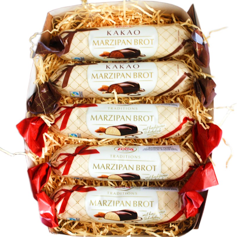 Состав: Марципановая буханка Zentis: Сахар, миндаль 23%, тертое какао, сироп глюкозы, какао масло, сухое молоко, эмульгатор (соялецитин, Е476), влагоудерживающий агент инвертаза, экстракт ванили. Может содержать следы других орехов. Марципановая буханка Zentis Какао: Сахар, миндаль 25%, вода, какао тертое, сироп глюкозы, какао масло, обезжиренный какао порошок, эмульгатор: лецитин (соевый), ферментный препарат микробного происхождения инвертаза, цельное сухое молоко. Может содержать другие орехи.