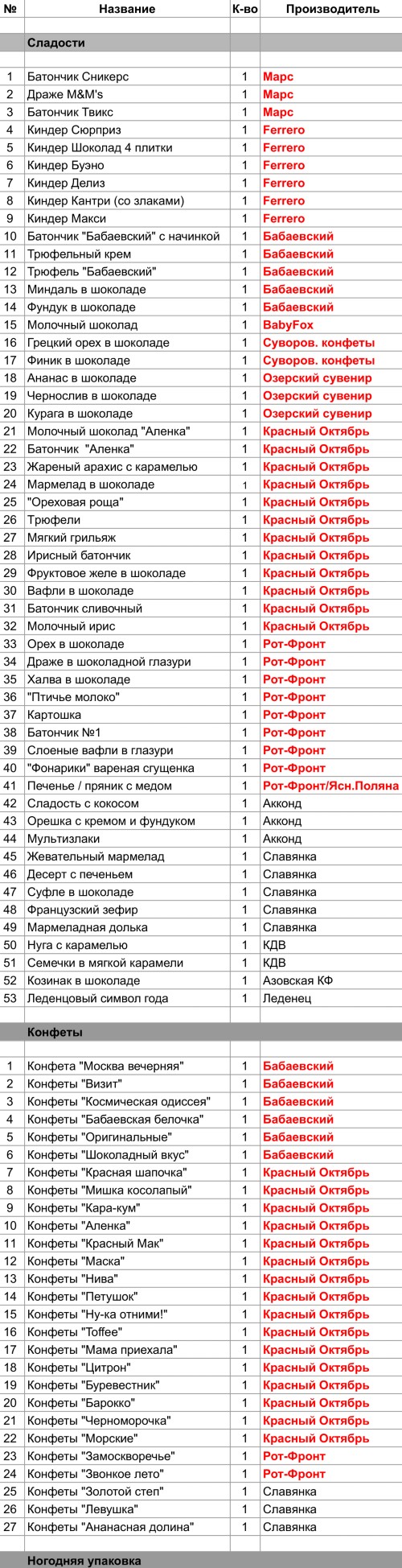 Молочный шоколад "Аленка" (1 шт), Батончик  "Аленка" (1 шт), Жареный арахис с карамелью (1 шт), Мармелад в шоколаде (1 шт), "Ореховая роща" (1 шт), Трюфели (1 шт), Мягкий грильяж (1 шт), Ирисный батончик (1 шт), Фруктовое желе в шоколаде (1 шт), Вафли в шоколаде (1 шт), Батончик сливочный (1 шт), Молочный ирис (1 шт), Конфеты "Красная шапочка" (1 шт), Конфеты "Мишка косолапый" (1 шт), Конфеты "Кара-кум" (1 шт), Конфеты "Аленка" (1 шт), Конфеты "Красный Мак" (1 шт), Конфеты "Маска" (1 шт), Конфеты "Нива" (1 шт), Конфеты "Петушок" (1 шт), Конфеты "Ну-ка отними!" (1 шт), Конфеты "Toffee" (1 шт), Конфеты "Мама приехала" (1 шт), Конфеты "Цитрон" (1 шт), Конфеты "Буревестник" (1 шт), Конфеты "Барокко" (1 шт), Конфеты "Черноморочка" (1 шт), Конфеты "Морские" (1 шт)